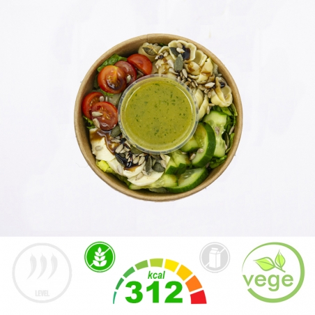 Składniki: Ser Mozzarella 16,7% (ser mozzarella (MLEKO pasteryzowane, sól, kwas cytrynowy, kultury bakterii kwasu MLEKOWEGO, podpuszczka mikrobiologiczna), Sos vinegrette 16% (oliwa z oliwek 37,8%, woda 19,9%, musztarda (woda, ocet spirytusowy,  GORCZYCA biała, GORCZYCA czarna, cukier, sól, przyprawy, barwnik: kurkumina) 12,9%,  ocet winny 12,9%, natka pietruszki 6,6%, miód 5%, sok z cytryny 3%, pieprz czarny 1%, sól 1%), Makaron muszelki 15,9% (makaron muszelki (semolina z PSZENICY durum, woda) 99,9%, sól 0,1%), Ogórek 15,9%, Pomidorki cherry 15,9%, Mix sałat 15,9% (mix sałat (rukola, cykoria escarola,  endywia frisee, radicchio) 100%), Słonecznik prażony 1,2%, Pestki dyni 1,2%, Krem balsamiczny 1,2% (krem z octem balsamicznym z Modeny [moszcz winogronowy, ocet balsamiczny (ocet winny, moszcz  winogronowy, barwnik: karmel amoniakalno-SIARCZYNOWY), ocet winny, substancja  zagęszczająca: guma guar, guma ksantanowa].